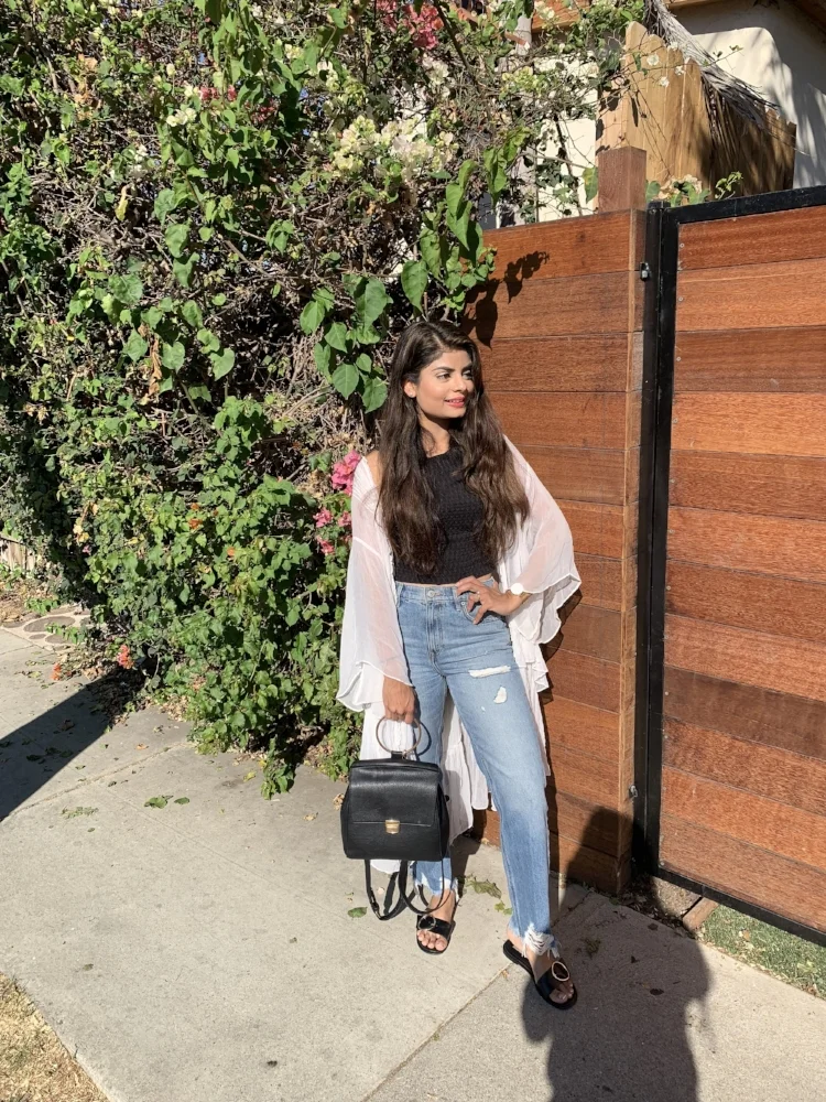 Top: I’m wearing this black boat neck top from Zara. I got it on sale from the $10 rack and it’s my favorite sleeveless top. It’s also a crop top, so it works perfectly with high waisted outfits. I bought this sheer white kimono from Urban Outfitters, almost a decade ago. It’s my favorite kimono and definitely most expensive, but so worth it. I use it every spring and summer. If you see anything similar to this, buy one—it’s perfect for pairing it with sleeveless tops and dresses in warm weather. Check out the sales going on especially on spring and summer wear because it’ll help you so much when it comes to layering, even in the winter!