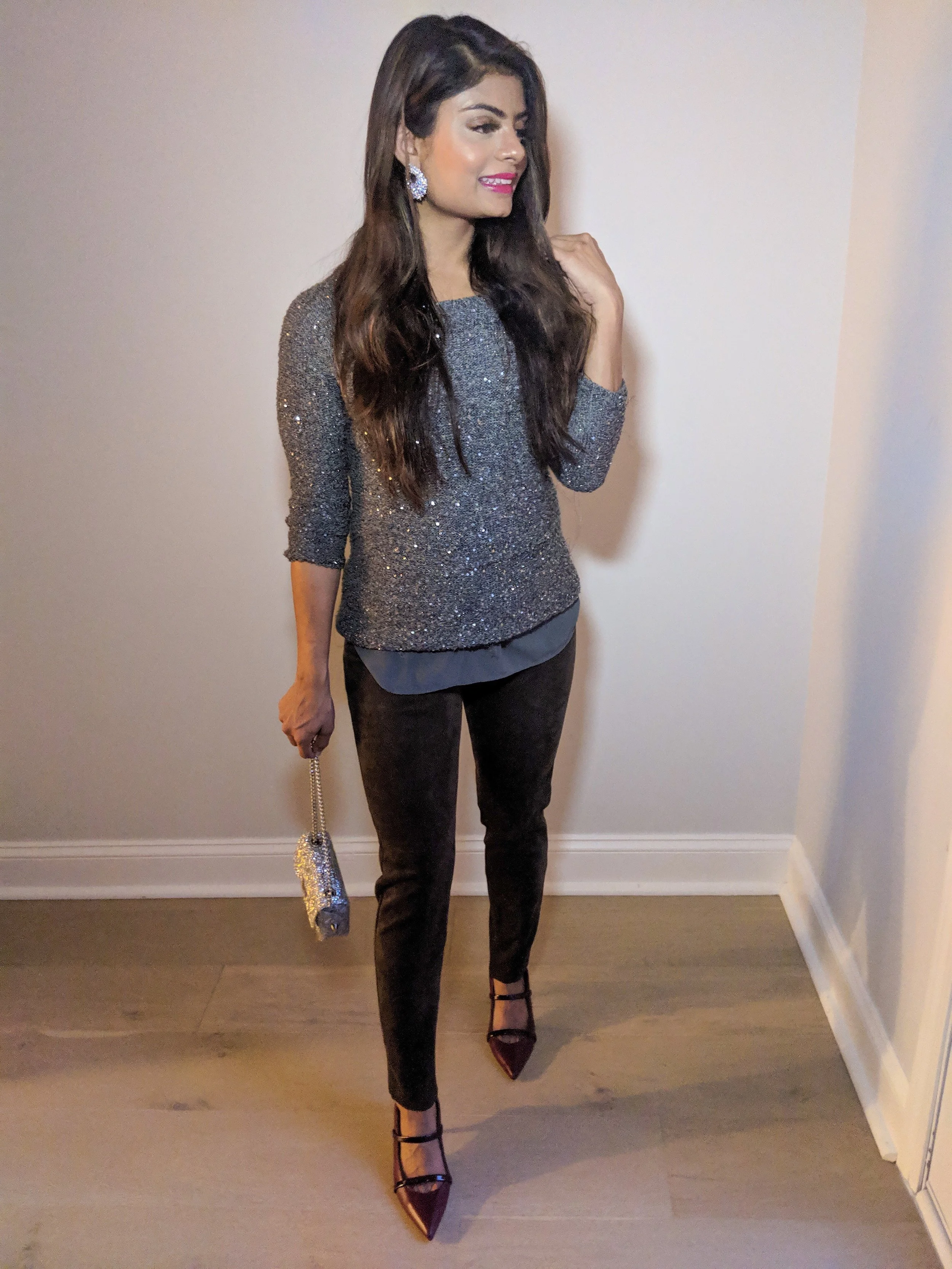 Top: I bought this glitter jumper from Zara about five years ago. I always steer away from super glamorous tops, but the very chic and classy cuts are the kind to keep in your closet. Pairing glitz and glam, with sober colors is the best recipe for your holiday outfit.