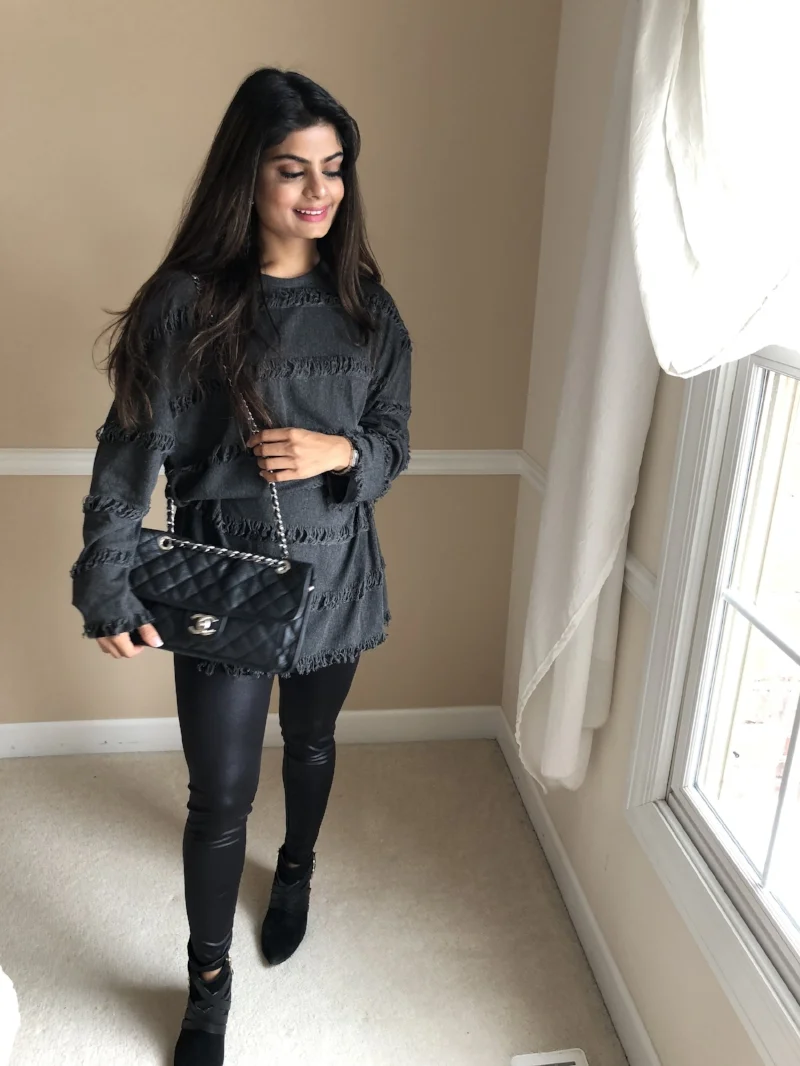 Top: I recently bought this grey sweater top on sale from Zara. I love the rugged look and nothing looks more badass in the winter than fringes in cuts in a nice warm sweater. I added a skinny belt to give a better silhouette. With the top, if you’re looking for a more casual and good girl vibe— anything will go with it. White pants, jeans, or make it more fun and do ripped jeans. I love how versatile it is.