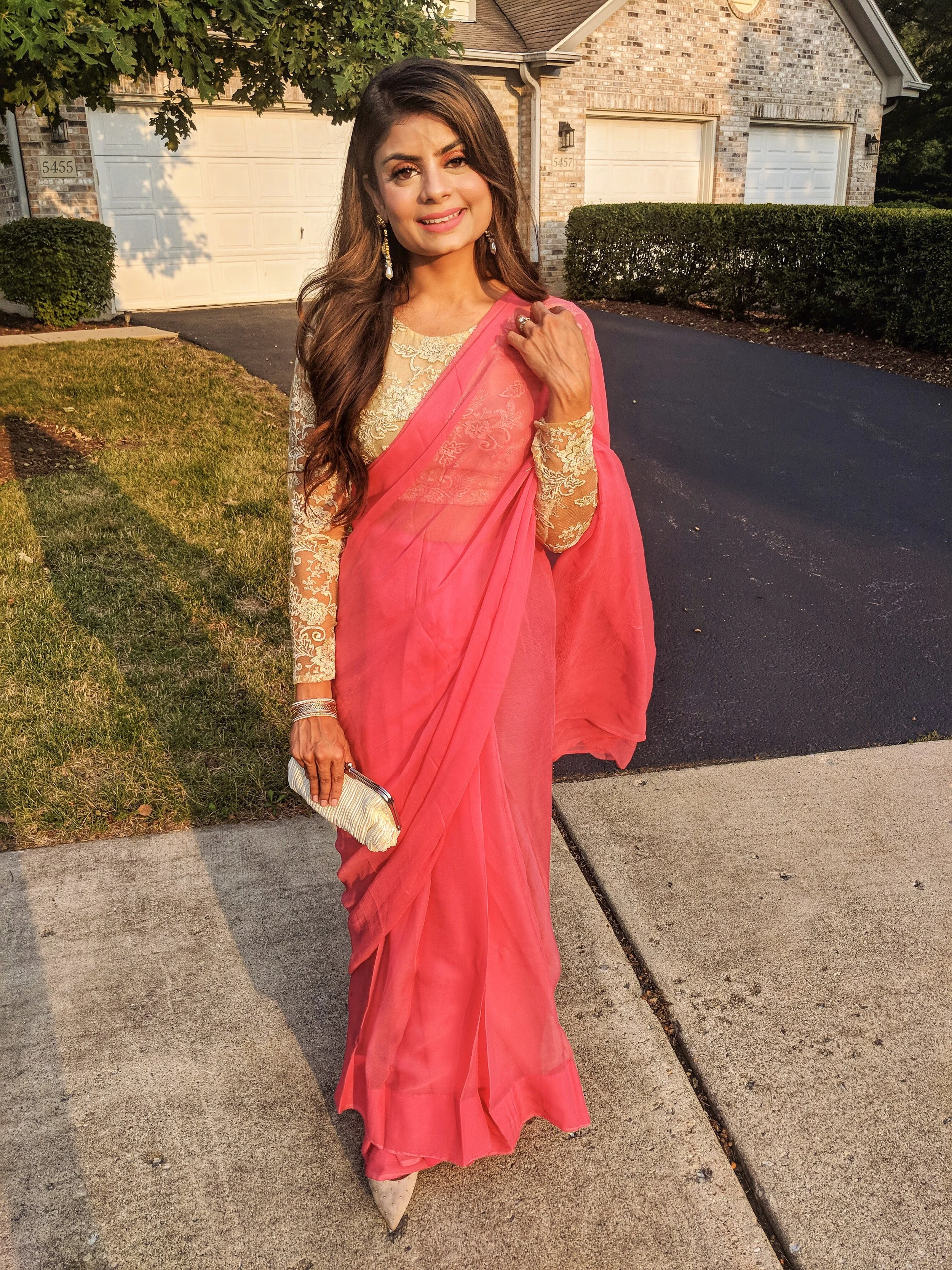 Sari: I love this peachy pink French chiffon. It was worth all the fabric and definitely getting it pleated before-hand to make it fairly easy to wear a sari. I still struggle with the sari quite often, but slowly I'm improving. Practice makes perfect. Peach colors are beautiful for spring and summer. I decided to wear this lovely color as one of my goodbyes to summer wear.