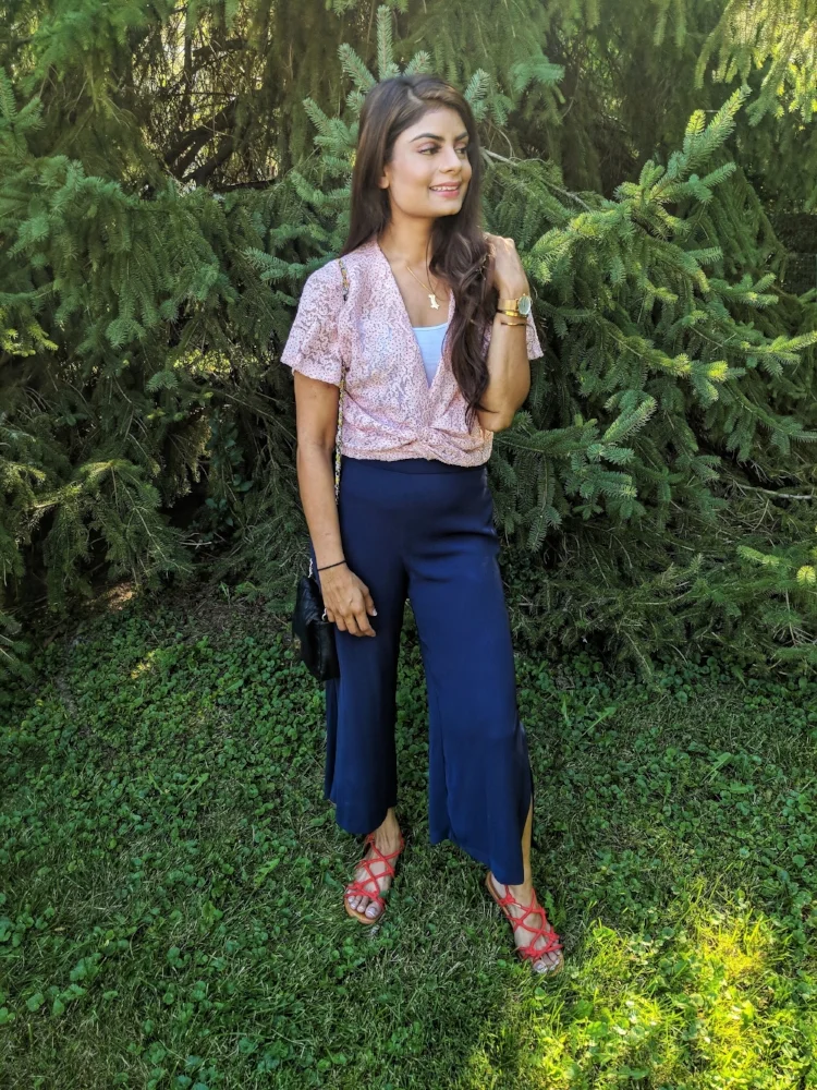 Top: I got this beautiful pink lace crop top from Zara. It’s such a gorgeous top, with a beautiful crop knotted. I’ve actually been wanting to wear this top all summer, but couldn’t find the perfect occasion. You can easily dress up this crop top bt pairing it with a skirt or keep it casual like I did and pairing it palazzo pants.