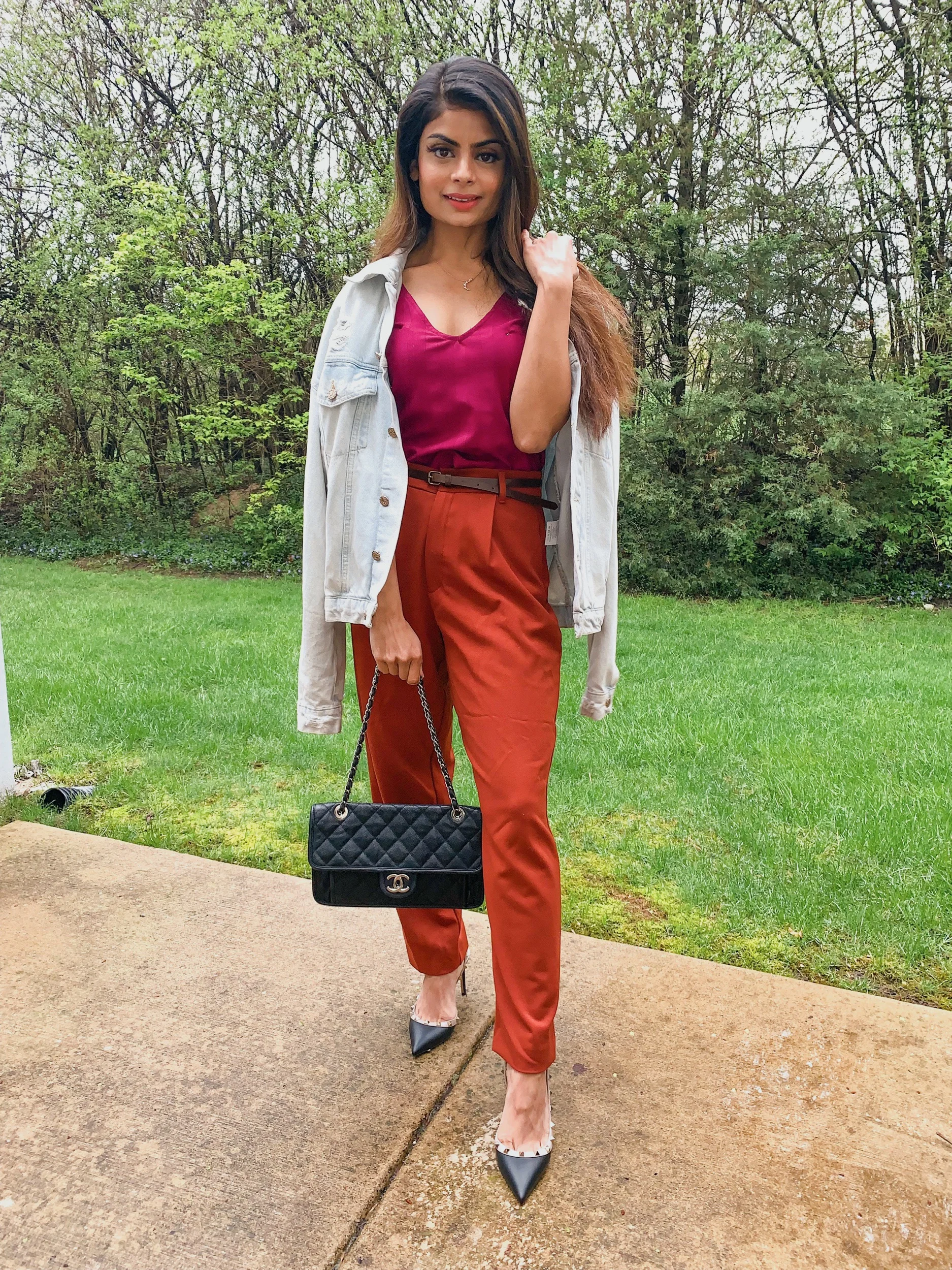 Top: I’m wearing a fuchsia sleeveless tank from Zara. I paired with my denim Seek Refuge jacket to make it more of a casual look. Together this combo is perfect for chilly or spring weather. I love these colors as well, they look amazing on olive skin tones and bring out our “glow”.