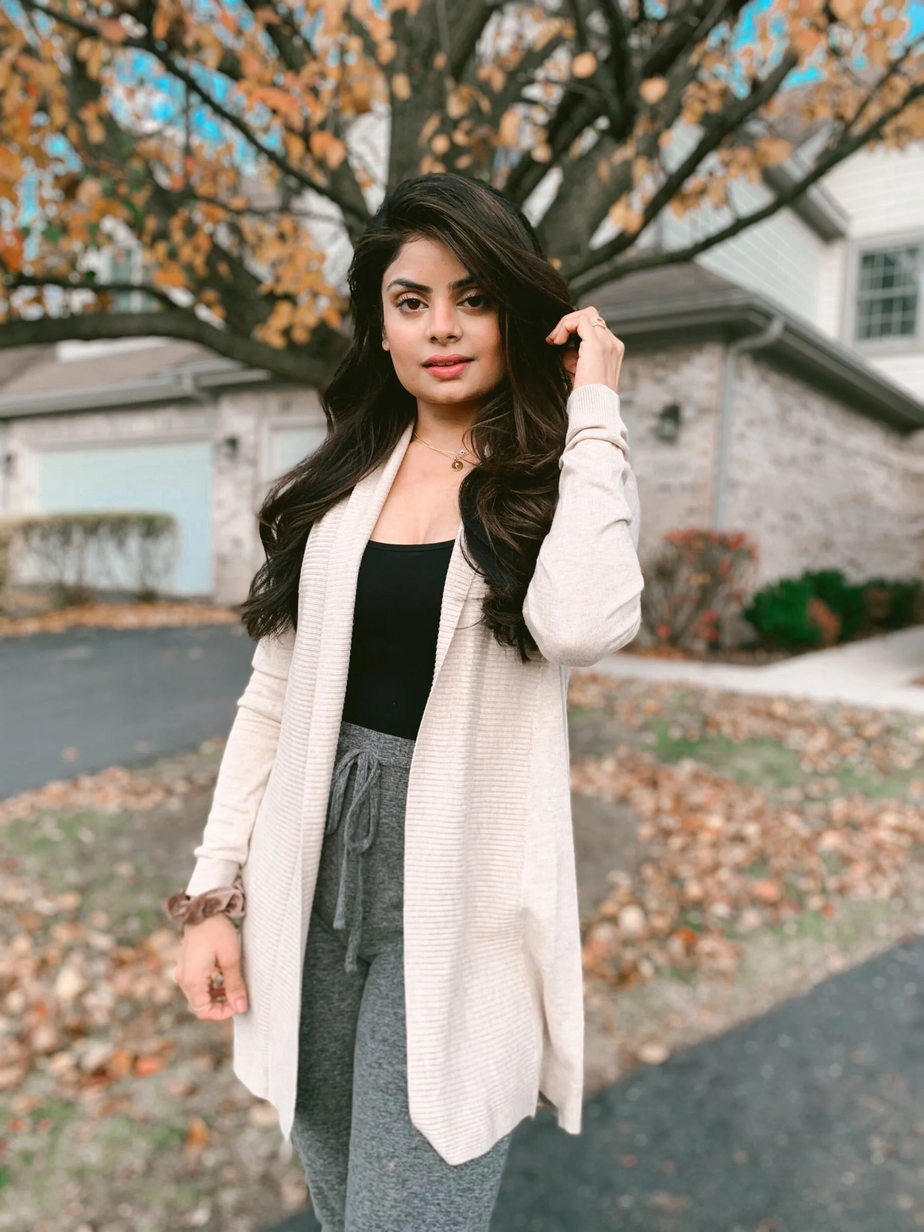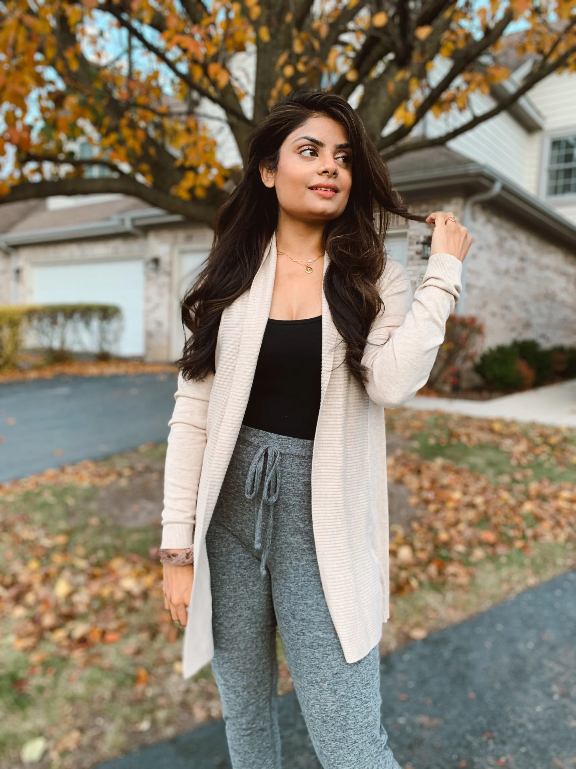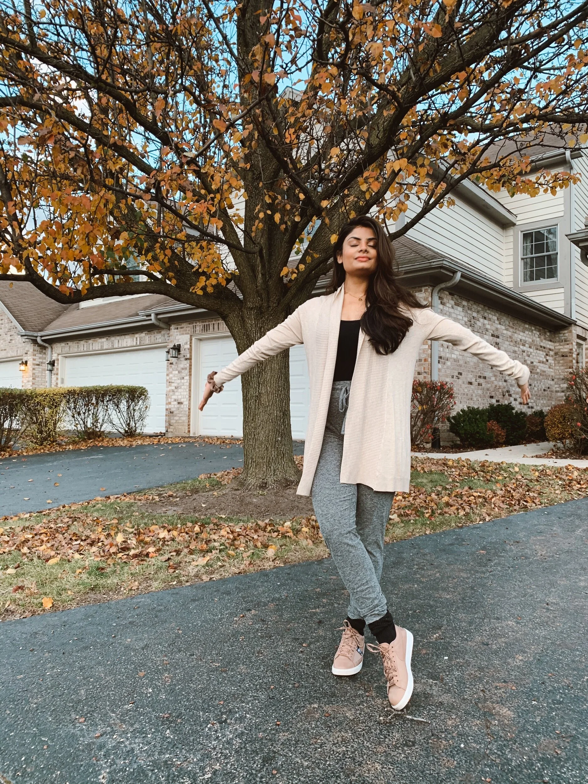 Top: I’m wearing an onesie bodysuit that I got from Amazon. It is incredibly helpful to layer with, and you can wear it with almost any top. I’ve been able to wear this bodysuit without buttoning it all the way during my changing body weight. I’ve paired it with a soft lounge cardigan from Nordstrom. I love this cardigan because it gives a more of a cleaned up, chic look. Here’s a similar one from ASOS. So you can be comfortable and look nice!