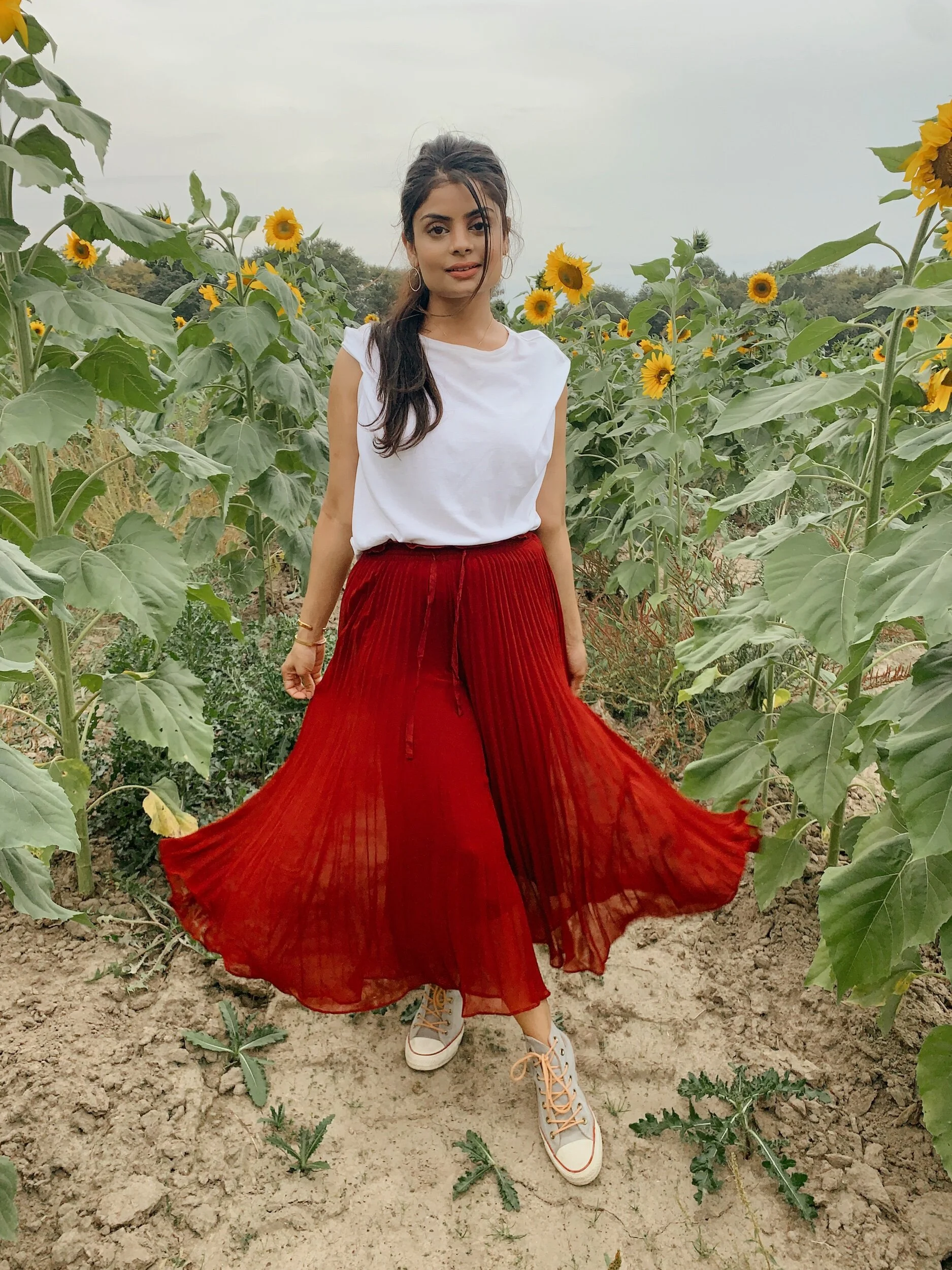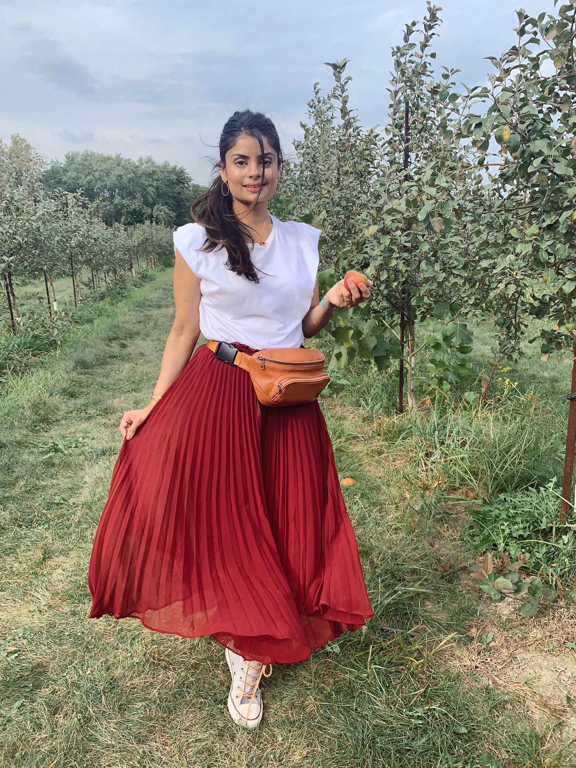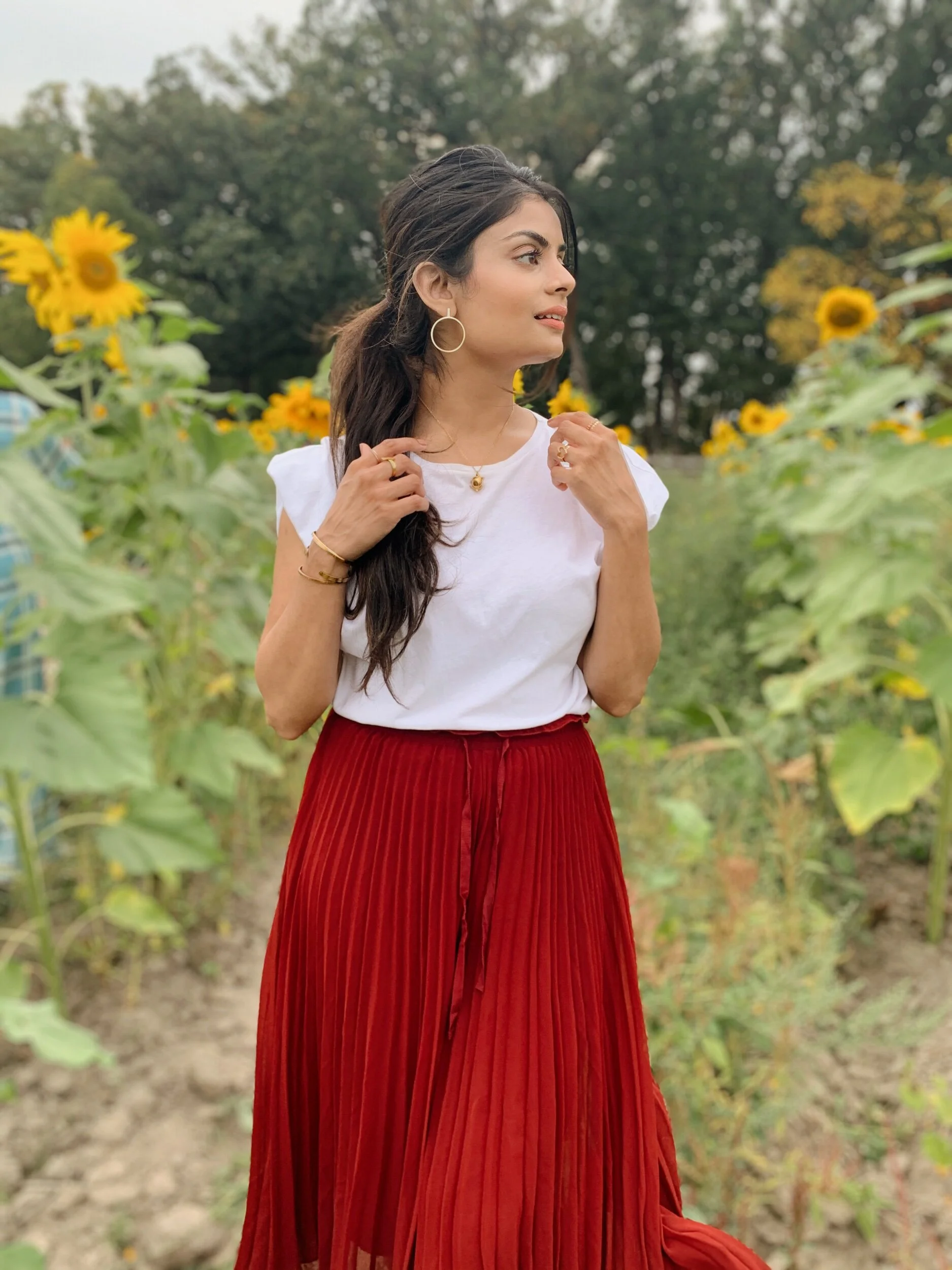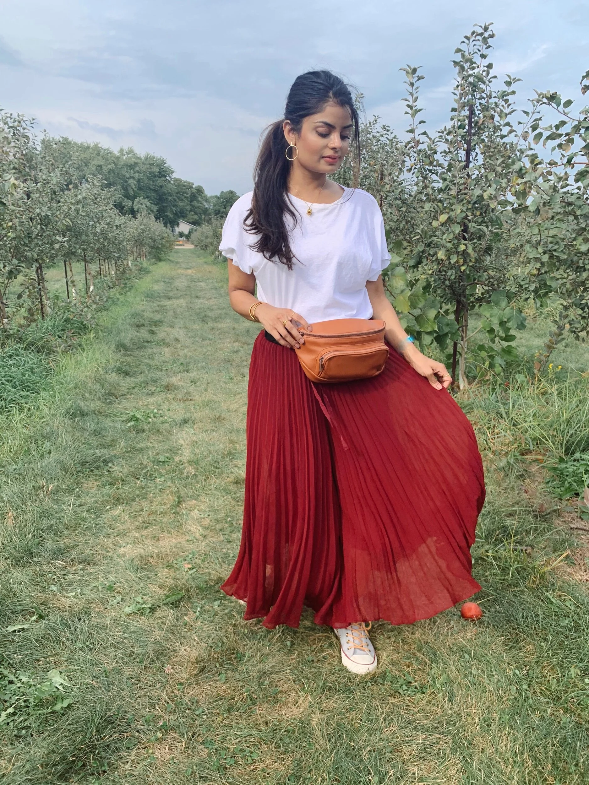 Bottoms: I’m wearing these super cute chiffon pleated culottes. I bought them in Spain last fall and I love the look that they give. They’re also very comfortable. Maroon is extremely trendy this season and can be easily paired with both dark and light colors to create the “fall” look. Here’s a similar pair in white or different colors from Shein. I’d prefer a purchase from a more sustainable brand like Asos however and these are available in satin pink.